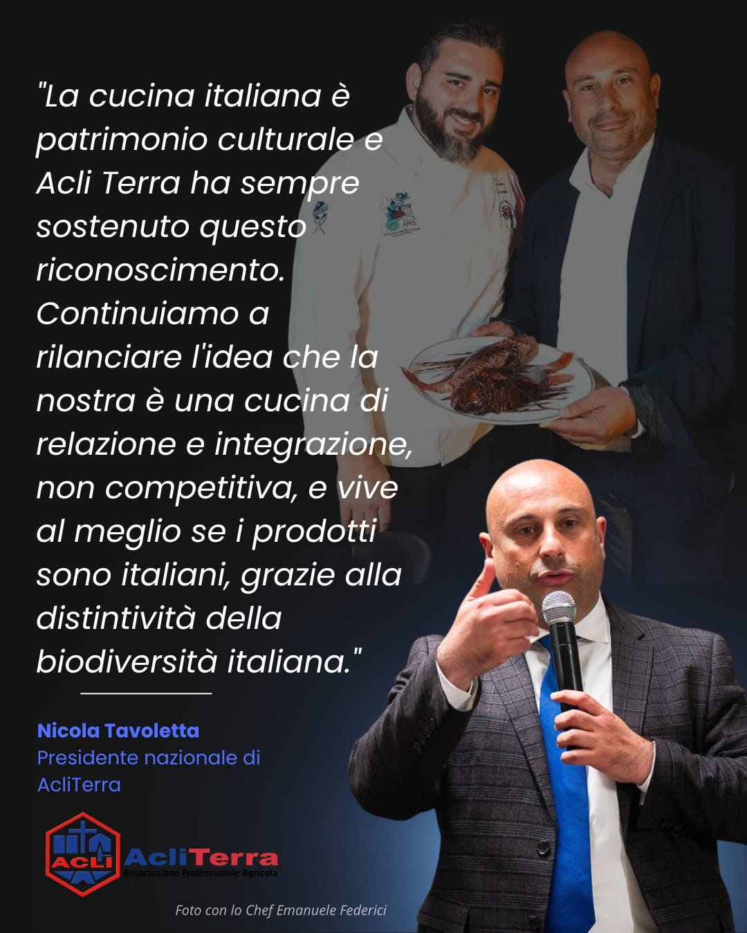 “Acli Terra ha sempre sostenuto l’idea che la cucina italiana fosse patrimonio culturale. Esultiamo per questo riconoscimento appena proclamato in India. La nostra cucina non è competitiva, ma è una *cucina di relazione* e di integrazione, che non teme il confronto ma che ama la capacità di essere generativa. Inoltre, essa vive al meglio quando i prodotti sono italiani, non per esclusione, ma per la distintività della nostra *ampia e copiosa biodiversità*”.